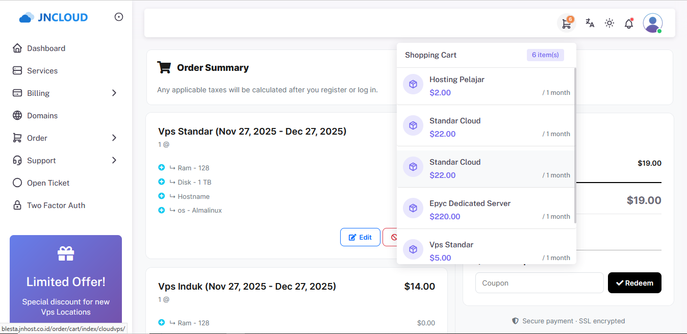 Elevate Your Blesta Experience with Premium Cloud Design Template Transform your billing platform into a stunning, professional showcase with our cutting-edge Blesta template. Meticulously crafted with modern cloud design principles and sophisticated material style aesthetics, this template doesn't just look good—it converts visitors into customers. 🎯 Powerful Admin Control Panel Take complete command of your website's appearance and functionality with our comprehensive admin options. Effortlessly manage promotional banners, configure eye-catching popups, customize styling to match your brand identity, and inject custom JavaScript/CSS for unlimited creative possibilities. Everything you need to stand out from the competition is right at your fingertips. ✨ Enhanced User/Client Experience Your clients deserve an interface that's both beautiful and functional. Here's what makes this template exceptional: Strategic Popup System - Capture attention instantly with customizable popups perfect for limited-time promotions, critical service announcements, special offers, or important updates that your clients simply cannot miss. Sidebar Promo Box - Keep your best deals always visible with an elegant promotional sidebar that drives conversions without being intrusive. Complete Template Overhaul - We've completely refactored the standard Blesta template from the ground up, eliminating clutter and introducing intelligent design patterns that guide users naturally through their journey. Dynamic, Non-Monotonous Layout - Say goodbye to boring, repetitive interfaces. Our carefully crafted views feature varying layouts and information density, creating visual interest that keeps users engaged and reduces bounce rates. Direct Control Panel Access - Streamline your clients' workflow with intelligent shortcuts embedded directly in service product displays, providing instant access to hosting control panels without unnecessary navigation. Modern Ticket System - Revolutionize your support experience with a clean, contemporary ticket interface that supports code syntax highlighting—perfect for technical support interactions that require precision and clarity. Sleek Invoice Pages - Professional, modern invoice displays that instill confidence and make payment processing feel premium and trustworthy. Organized Product Browsing - Beautifully designed category and product listing pages that make browsing your services an absolute pleasure. Exclusive Notification Icon - A unique feature you won't find in any other Blesta template! Our intelligent notification system in the top-right corner keeps clients informed about unpaid invoices, pending actions, and important account updates—dramatically reducing missed payments and improving customer satisfaction. 💰 Understanding the True Value Behind Our Pricing You might wonder about the investment required for this premium template. Here's the reality: This isn't a simple theme modification or a quick cosmetic update. We've invested hundreds of hours meticulously refactoring every single line of Blesta's standard codebase from scratch. Every feature you see—from the intelligent notification system to the seamless control panel shortcuts—required extensive development, rigorous testing, and countless iterations to achieve perfection. Building premium features that actually work flawlessly while maintaining clean, optimized code is an intensive process that demands exceptional skill, unwavering dedication, and significant time investment. The pricing we offer is remarkably reasonable—even modest—when you consider the enormous effort, technical expertise, and sheer man-hours that went into creating this professional-grade solution. You're not just buying a template; you're acquiring months of specialized development work at a fraction of what it would cost to build in-house. 🚀 Built-in Marketing Arsenal Why pay for expensive third-party marketing tools when you can have them integrated seamlessly? Our built-in popup and promo box systems empower you to communicate effectively with your audience—whether you're launching flash sales, announcing service updates, sharing company milestones, or promoting seasonal offers. Marketing has never been this effortless. 💎 Investment Options Tailored to Your Needs Standard Package - $60 Get started with one full year of updates and support. Perfect for businesses who want premium design without long-term commitment. 🔗 Order Now: https://www.jnhost.co.id/member/cart.php?a=add&pid=118&language=english¤cy=2 Lifetime VIP Package - $180 ⭐ Best Value Unlock lifetime updates PLUS unlimited customization assistance! We'll help you modify colors, reposition elements, add custom features, and fine-tune every aspect to perfectly align with your brand identity and business vision. This isn't just a template—it's a partnership for success. 🔗 Order Now: https://www.jnhost.co.id/member/cart.php?a=add&pid=119&language=english¤cy=2 📺 See It In Action Experience the difference yourself with our live demo: Frontend Demo: https://blesta.jnhost.co.id/ Client Area Demo: https://blesta.jnhost.co.id/client/login/ Demo Credentials: Email: demoblesta@jnhost.co.id Password: akublesta Don't settle for ordinary when extraordinary is within reach. Invest in a template that not only meets today's standards but sets the benchmark for tomorrow's expectations. We accept payments in USD via Cryptocurrency and PayPal. Note: For PayPal payments, please submit a support ticket after placing your order. Admin Page Order Page Ticket Page Login Page Service View After Login
